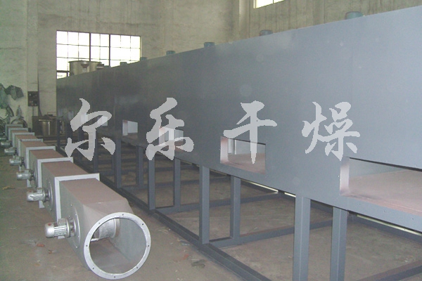 物料由加料器均勻地鋪在網(wǎng)帶上,網(wǎng)帶一般采用12-60目不銹鋼絲網(wǎng),由傳動裝置拖動在干燥機內(nèi)移動。干燥機由若干單元組成,每一單元熱風單獨循環(huán),部分尾氣由專門排濕風機排出,廢氣由調(diào)節(jié)閥控制,熱氣由下往上或由上往下穿過鋪滿物料的網(wǎng)帶完成熱量與質(zhì)量傳遞的進程,帶走物料水份。網(wǎng)帶緩慢移動,運行速度可根據(jù)物料溫度自由調(diào)節(jié),干燥后的成品連續(xù)落入收料器中。上下循環(huán)單元根據(jù)用戶需要可靈活配備,單元數(shù)量亦可根據(jù)需要選取。