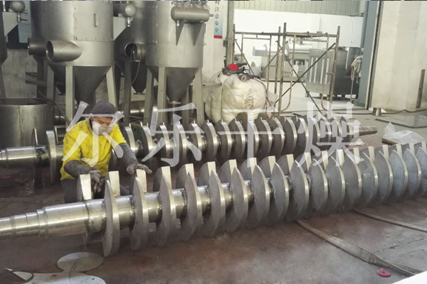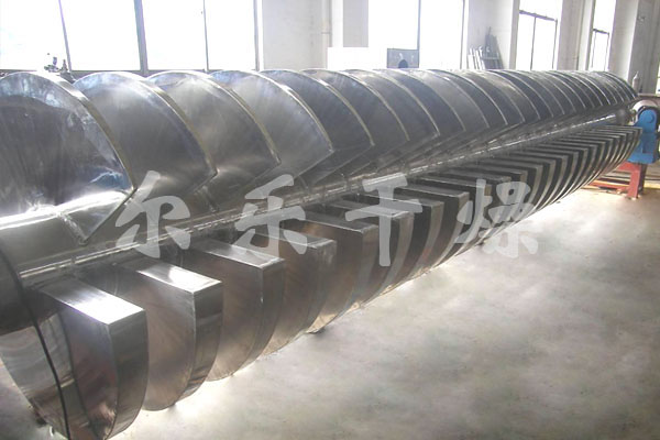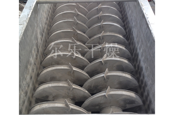 空心軸上密集排列著楔型中空漿葉,熱介質(zhì)經(jīng)空心軸流經(jīng)漿葉。單位有效容積內(nèi)傳熱面積很大,熱介質(zhì)溫度從-40℃到320℃,可以是水蒸汽,也可以是液體型:如熱水、導(dǎo)熱油等。間接傳導(dǎo)加熱,沒有攜帶空氣帶走熱量,熱量均用來加熱物料。熱量損失僅為通過器體保溫層向環(huán)境的散熱。楔型漿葉傳熱面具有自清潔功能。物料顆粒與楔型面的相對運(yùn)動(dòng)產(chǎn)生洗刷作用,能夠洗刷掉楔型面上附著物料,使運(yùn)轉(zhuǎn)中一直保持著清潔的傳熱面。漿葉干燥機(jī)的殼體為Ω型,殼體內(nèi)一般安排二到四根空心攪拌軸。殼體有密封端蓋與上蓋,防止物料粉塵外泄而充分發(fā)揮作用。