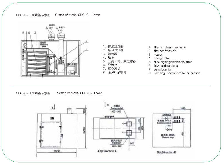 機由風(fēng)機本將一部分新鮮空氣經(jīng)初、中、高三效過濾,達(dá)到十萬級凈化,經(jīng)蒸汽熱交換器,使空氣升溫至一定溫度.通過過濾器使熱空氣凈化后.再由左側(cè)分流板分至各層,使熱風(fēng)平均通過每層被干燥的物料。濕空氣從烘盤底下的傾斜風(fēng)道抽出后,經(jīng)離心風(fēng)機使一部分濕空氣排出烘箱外,另一部分空氣繼續(xù)循環(huán)加熱,達(dá)到干燥目的。