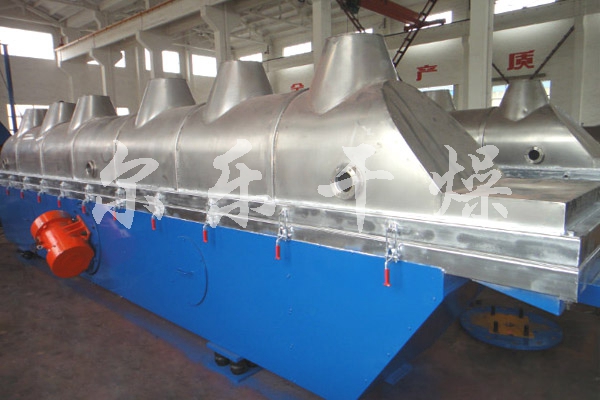 物料自進(jìn)料口進(jìn)入機(jī)內(nèi), 在振動(dòng)力作用下, 物料沿水平方向拋擲向前連續(xù)運(yùn)動(dòng),熱風(fēng)向上穿過(guò)流化床同濕料換熱后, 濕空氣經(jīng)旋風(fēng)分離器除塵后由排風(fēng)口排出, 干燥物料由排料口排出。