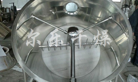 空氣經(jīng)加熱凈化后,由引風(fēng)機(jī)從下部導(dǎo)入,穿過(guò)料斗的孔洞板。在工作室內(nèi),經(jīng)攪拌和負(fù)壓作用形成流態(tài)化,水份快速蒸發(fā)后隨著排氣帶走,物料快速干燥。