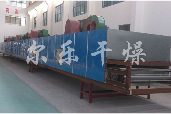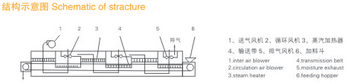 物料由加料器均勻地鋪在網(wǎng)帶上,網(wǎng)帶一般采用12-60目不銹鋼絲網(wǎng),由傳動裝置拖動在干燥機內(nèi)移動。干燥機由若干單元組成,每一單元熱風單獨循環(huán),部分尾氣由專門排濕風機排出,廢氣由調(diào)節(jié)閥控制,熱氣由下往上或由上往下穿過鋪滿物料的網(wǎng)帶完成熱量與質(zhì)量傳遞的進程,帶走物料水份。網(wǎng)帶緩慢移動,運行速度可根據(jù)物料溫度自由調(diào)節(jié),干燥后的成品連續(xù)落入收料器中。上下循環(huán)單元根據(jù)用戶需要可靈活配備,單元數(shù)量亦可根據(jù)需要選取。