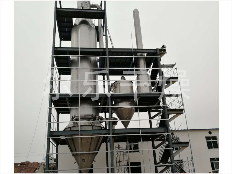 料液通過(guò)隔膜泵高壓輸入,噴出霧狀液滴,然后同熱空氣并流下降,大部分粉粒由塔底排料口收集,廢氣及其微小粉末經(jīng)旋風(fēng)分離器分離,廢氣由抽風(fēng)機(jī)排出,粉末由設(shè)在旋風(fēng)分離器下端的授粉筒收集,風(fēng)機(jī)出口還可裝備二級(jí)除塵裝置,回收率在96-98%以上。